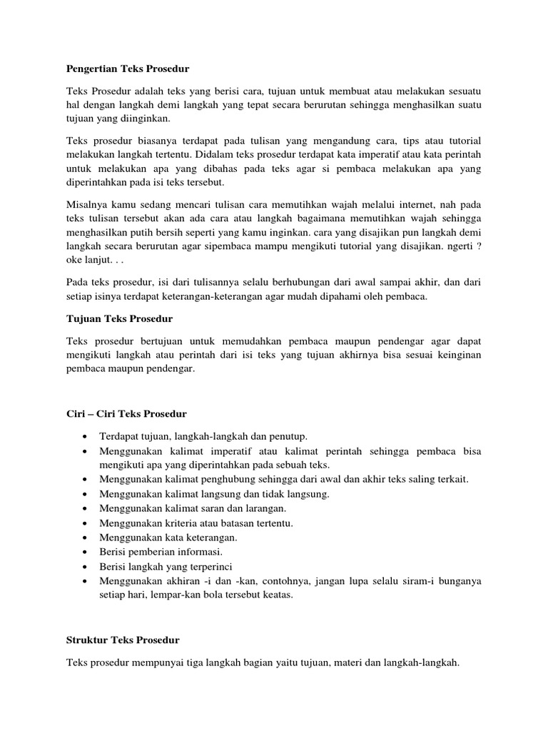 Kalimat yang mengandung perintah dalam teks prosedur adalah. Akan tetapi untuk memahami teks prosedur tidaklah semudah itu karena ada beberapa syarat yang harus ada pada teks prosedur itu. Terdapat verba tingkah laku c. Tolong matikan kran air itu!
