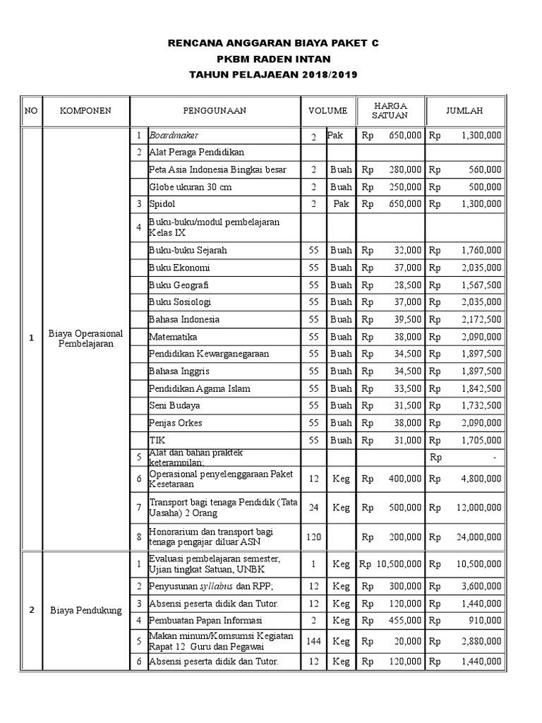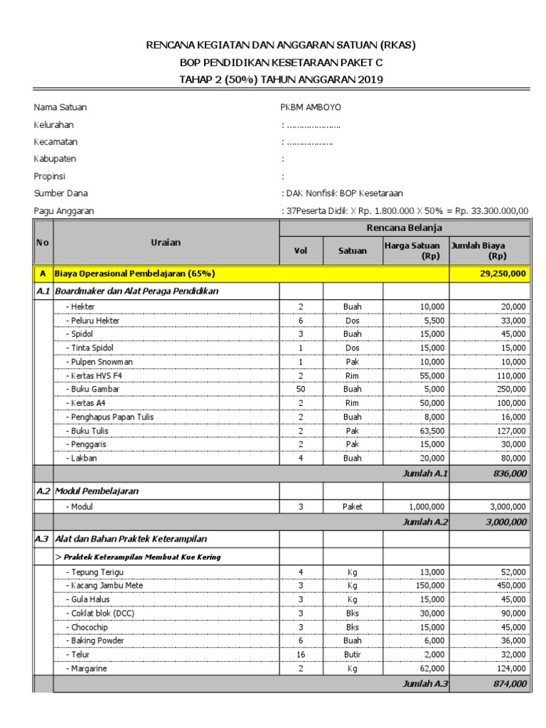 Contoh Rkas Bop Paket A B C Sesuai Juknis Bop Pendidikan Kesetaraan Format Administrasi Desa