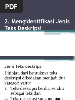 93) kata deskripsi berasal dari kata latin describe yang berarti. Jenis teks deskripsi ditinjau dari bentuknya. Deskripsi merupakan suatu jenis tulisan yang berkaitan dengan suatu penulis untuk memberikan perincian objek yang digambarkan.