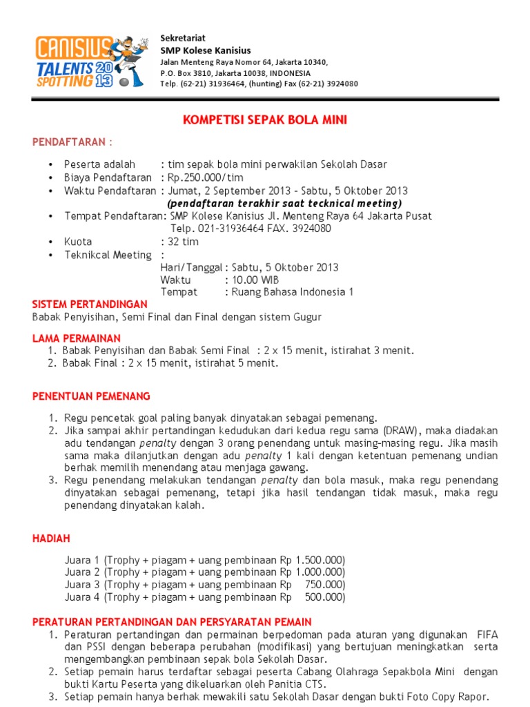 2 x 20 menit dengan waktu istrahat 10 menit. Bola yang digunakan ukuran no 4 (empat).